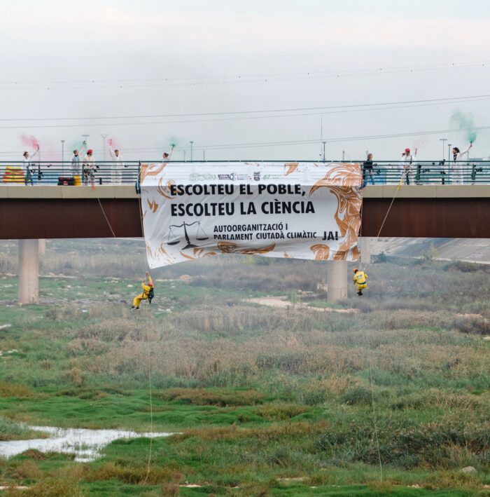 Nos colgamos del Puente de la Solidaridad para reclamar soluciones a la crisis ecosocial 15 activistas de 5 movimientos sociales desplegamos una pancarta en el Puente de la Solidaridad de Valencia. La acción se realizó tras el primer año de la DANA, que causó el fallecimiento de 230 personas y miles de animales, a su paso por Valencia el 29 de octubre de 2024. Denunciamos la inacción y el negacionismo climático. […]